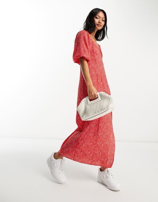 Mango Puff Sleeve Midi Dress In Red And White Spot Asos